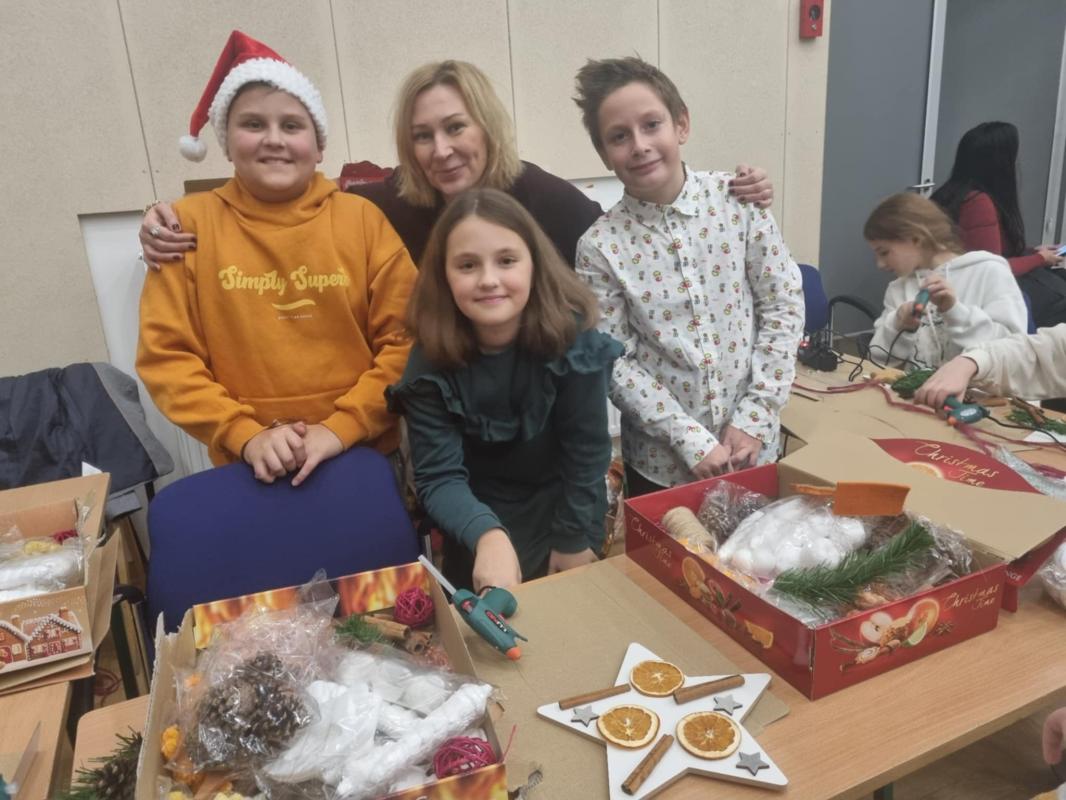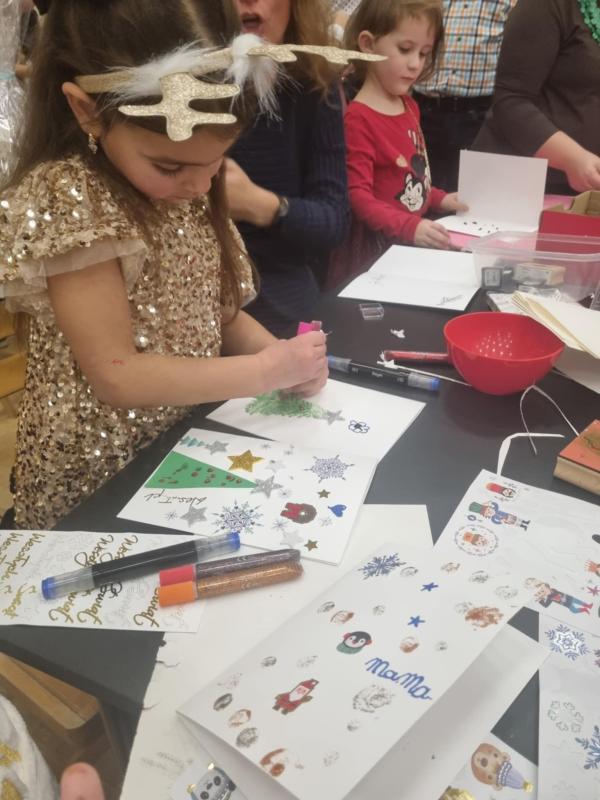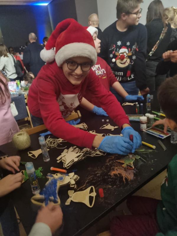 Następnie uczestnicy kiermaszu wzięli udział w warsztatach artystycznych. Pod okiem nauczycieli i wolontariuszy tworzyli kartki świąteczne, łańcuchy i inne dekoracje choinkowe,